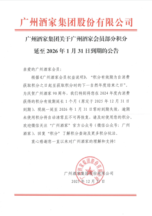 广州酒家集团关于广州酒家会员部分积分延至2026年1月31日到期的公告