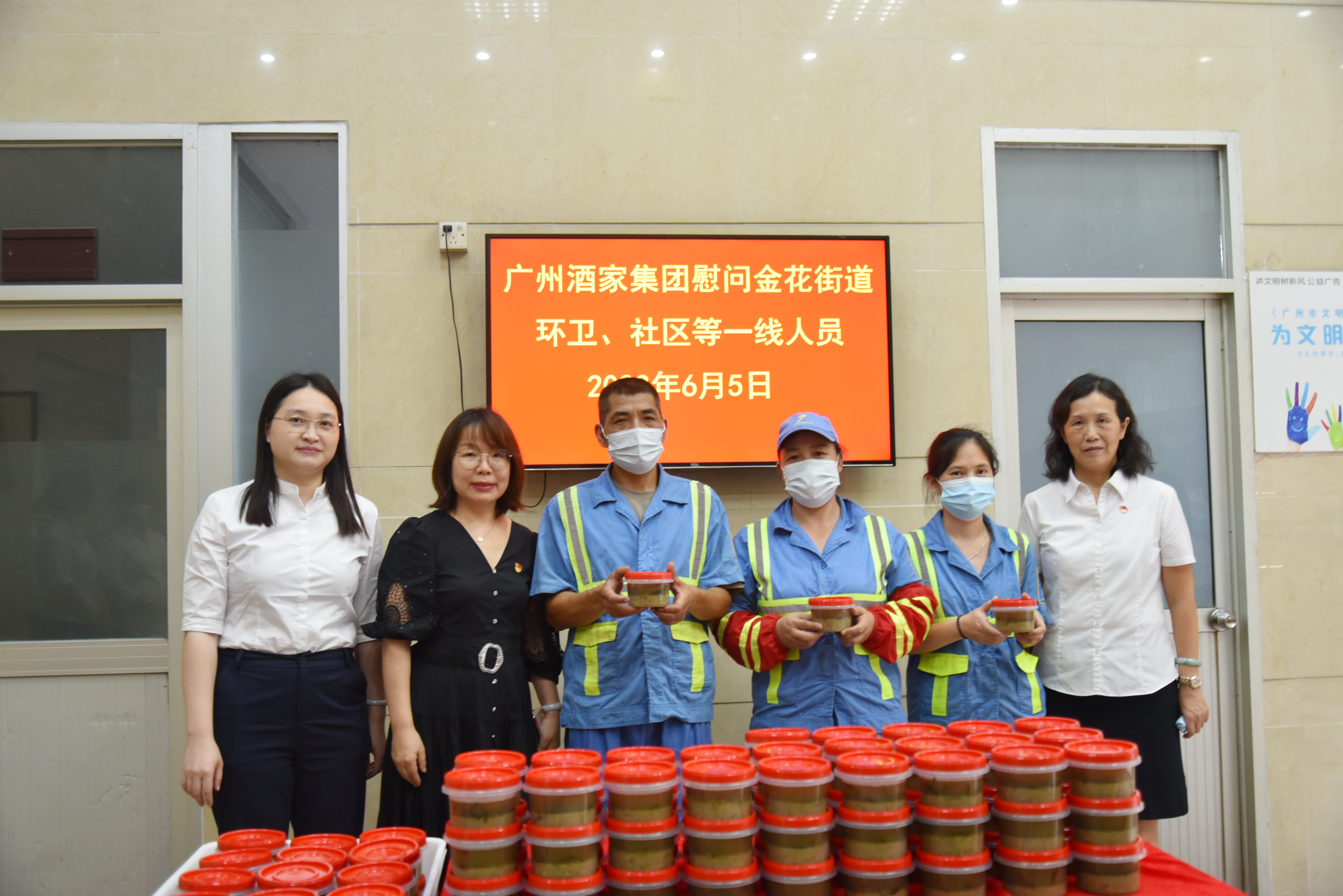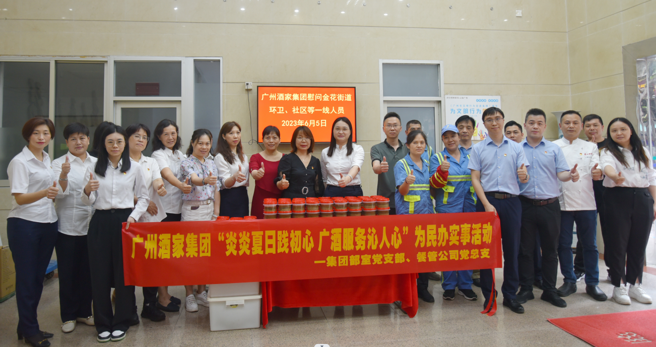 为深入开展学习贯彻习近平新时代中国特色社会主义思想主题教育,广州酒家集团部室党支部、餐管公司党总支将主题教育与为群众解难题、办实事紧密结合,6月5日下午,联合荔湾区金花街道开展“炎炎夏日践初心 广酒服务沁人心”慰问关爱一线人员活动,为奋战在酷暑一线人员送去凉意,献上关怀。集团党委副书记、董事孙晓莉,集团部室党支部书记杨青及双方党组织党员代表参加本次活动。