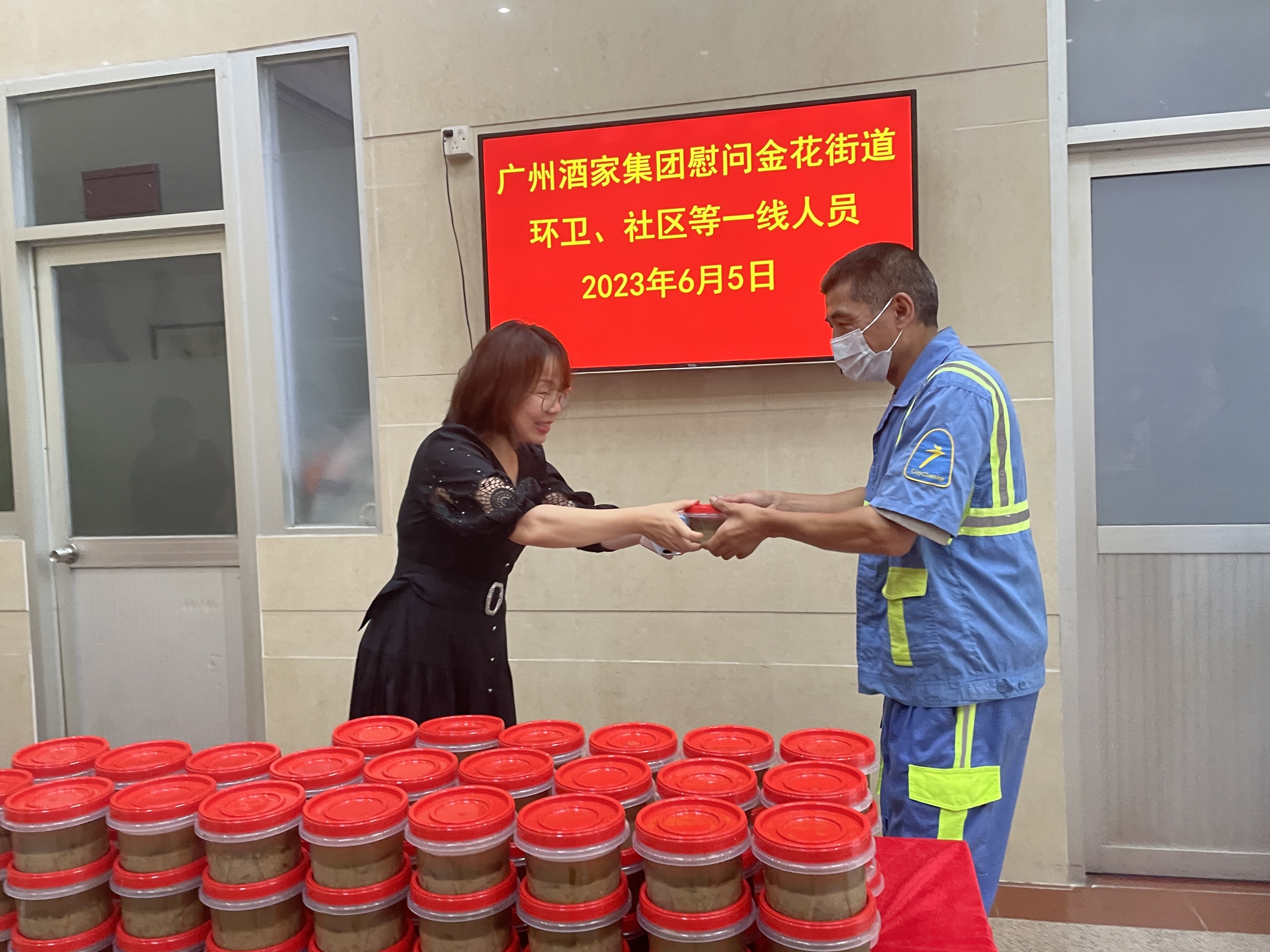 关爱沁人心,一线送清凉,环卫、社区等一线人员向广州酒家集团的高温送清凉办实事活动表示感谢,纷纷表示将继续努力工作,将党组织的关怀转化为强大的工作动力,发扬不怕苦、不怕累的奋斗精神,履行岗位职责,以更加饱满的精神状态做好城市洁净工作。