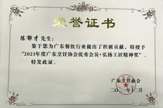 近日,2021广东烹饪协会优秀会员表彰会在汕尾举行。广州酒家集团餐管公司及粤菜师傅陈郁才分别荣获2021年度广东烹饪协会优秀会员“积极推动粤菜师傅工程贡献奖”“弘扬工匠精神奖”。